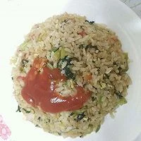 (4)再倒入米饭、蟹柳、杂气菜翻炒一下。