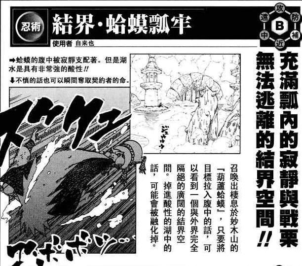 召唤出气息在妙木山的葫虚蛤蟆,只要将目标拉入腹中的话,可以看到一个与外界完全隔绝的广阔的结界空间。掉进酸性的湖中的话,可能会被融化掉。