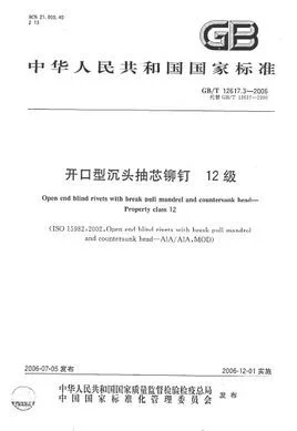 英文标准名称: Open end blind rivets with break pull mandrel and countersunk head―property class 12