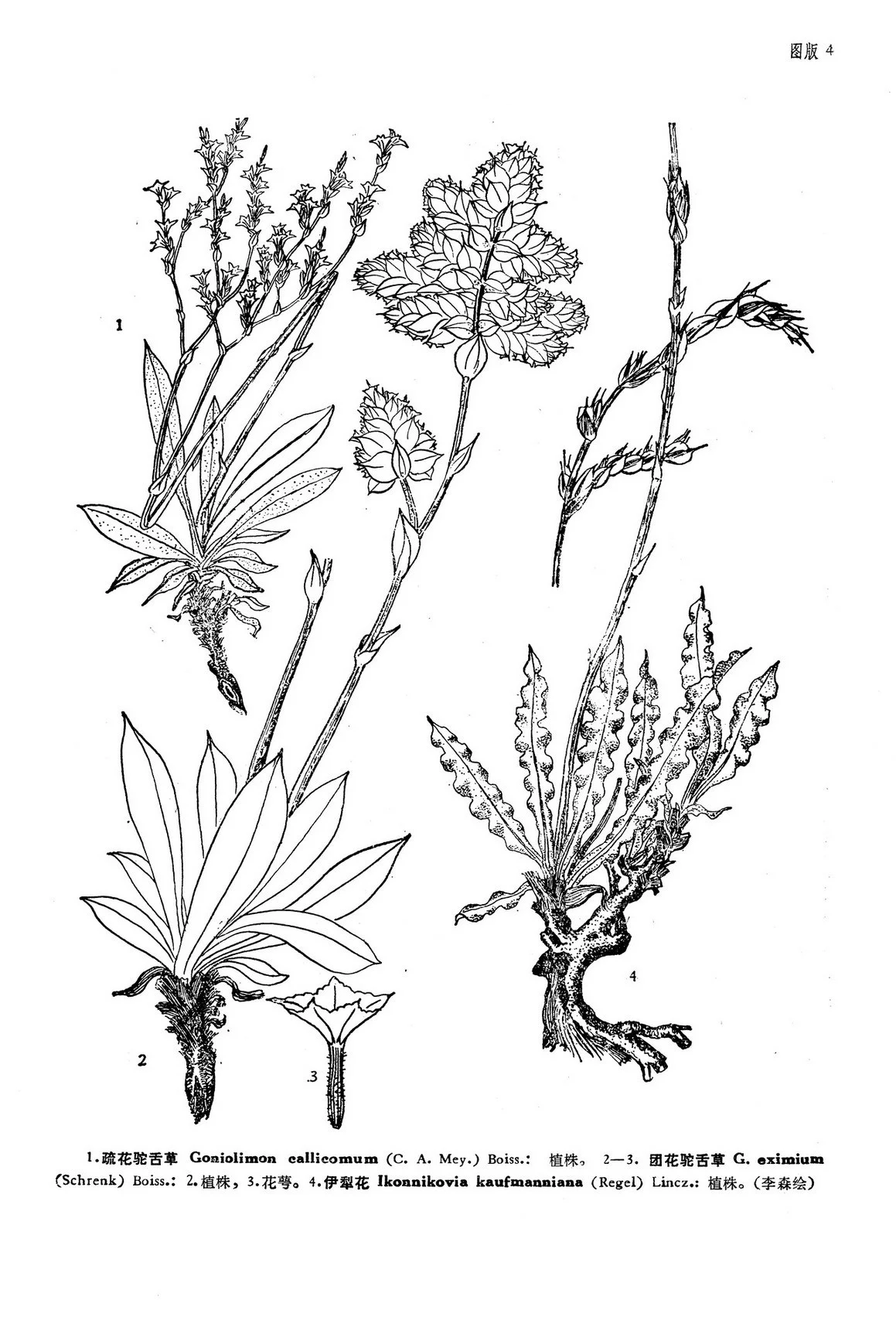至于根据采于伊宁地区、赛里木湖和天山等地的标本而发表"叶下面密被、上面经常疏被白色钙质颗粒"的Statice speciosa L. var.βlepidota Regel,看来其成分比较混杂;由于描写简略而难以核考。从分布情况推测:采于赛里木湖一带的标本或许是驼舌草G. speciosum(L.)Boiss.,采于天山的标本则可能是团花驼舌草。