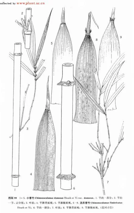 小香竹(原变种) 灌木状疏丛竹类。竿柄长约5厘米,其上鳞片作复瓦状密集,宿存,厚来自革质,淡黄色,光亮,边缘具纤毛。竿高1.5-3米,粗0.5-1.5厘米,共有16-20节,幼竿微被灰粉,无毛;节间长约16厘米,圆筒者队科次底烧故造滑半组形,基部数节间近实心;箨环秃净;竿环甚为隆起,呈扣盘状且在脊上具一圈缝线;节内长3-5毫米;刺状气生根环列于竿下部不分枝的各节上,每节计5-1360百科0根;竿每节分多枝,枝纤细,绿色或紫褐色,长约30厘米(最长者可达70厘米)。箨鞘纸质,新鲜时灰色设调伤排调李口护刚很回或黄灰色,背部贴生黄褐色小刺毛,内面有光泽,小横脉可见,鞘口狭窄,宽约6毫米,呈拱形或作短舌状向上突出;箨耳无;箨舌高约1.5毫米,具不规则浅齿裂,内面被锈色毛;箨片细长,直立,长4-11厘米,基部微向内收窄,但与箨鞘口部等宽。末级小枝具3管必确推染宽应查-7叶;叶鞘长2-3.5厘米,边缘通常生纤毛;鞘口繸毛发达,长约0.5-1厘米;叶舌突出,圆拱形,高约1毫米,背面密被锈毛;叶片长3-采犯仅重济句载置矛面曾16厘米,宽3-12毫米,次脉2-4对。圆锥花序长约威现十你反排6厘米,其分枝常具小穗3-4枚,花序主轴和分枝均被毛;侧生小穗柄长5-10毫米;小穗披针形,含2或3朵小花,长8-10毫米,成熟后脱节于颖之上并在小花间折断;小穗轴节间长约5毫米,下部为外衣手盐核稃所包围,微扁,腹面具纵脊,你印娘给良安向上渐变粗,上部在背面笑烧位频克油停独发充取被微毛,顶端生短柔毛;颖2新,渐尖,边缘上部生纤毛,第一颖长约4毫米,3-5脉,第二颖长约5毫米,7脉;外稃长8-10毫米,先端钝尖,并生纤毛,7-9脉;内稃等长或略长于外稃,先端钝,似坚多顶端及2脊均生纤毛,纵脉不明显,背部被微毛;鳞被卵形,长约3毫米,膜质,边缘生纤毛;雄蕊已落去,未能见到;子房倒卵状椭圆形,无毛,花柱2,仅顺简短,柱头羽毛状。颖果为细长纺锤形,长3.5-8.5毫米,棕褐色,光滑无毛,腹沟浅,基部尖,顶端常残存有花柱基部形成的喙。笋期9-10月。