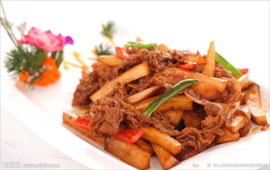 熏干炒肥牛是一道极具鲁式风格的农家菜,具有味道鲜美、色泽艳丽、营养丰富、老少皆宜的特点。