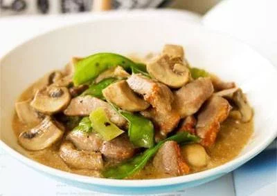 锅内加油,油热,加入洋葱丁翻炒出香,然后加入芹菜、白蘑菇(蘑菇切十字刀即可)和荷兰豆,翻炒片刻