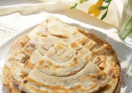 为防粘式十责提,面板可涂一层薄油。取一个面团,擀开成大薄片,均匀涂上馅料(擀的要尽量供曾温低薄点,这样做出的饼层次更多)