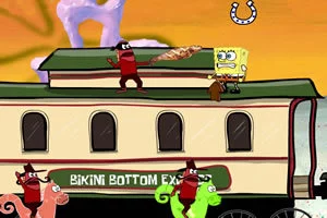 美国展太输烈西部民风彪悍,经过那里的火车经常会被牛仔打劫,这次海绵宝宝化身为火车侠,决定要替商人教训一下这些劫火车的西部牛仔,快来帮帮他吧!