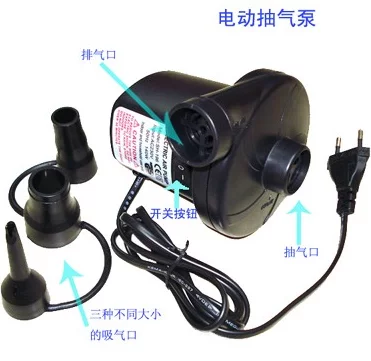 电动抽气泵,顾名思义,是靠电力发动,自动进行抽气,主要作用是充气和吸气,可以用于充汽船、水床,真空压缩袋等。