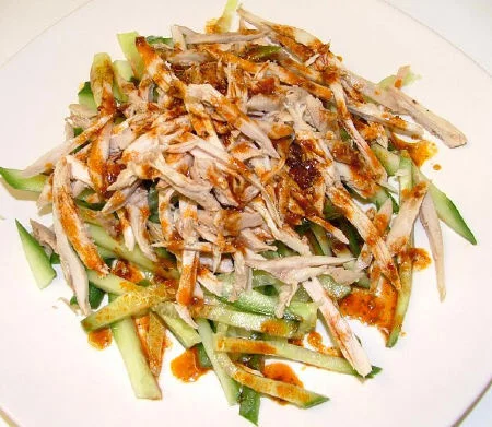 1、鸡去内脏洗净,入锅煮,汤烧开撇尽浮沫,煮至刚熟,捞入凉开水中,漂凉后去骨,切成约9厘米长、0.来自3厘米粗的二粗丝,盖在葱丝上。