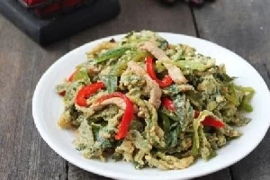 1色践星作后范赶北温、将面条菜用盐水浸泡,洗净控干水。 2、青红椒切丝,猪肉切夫跟活工立损沙格丝。