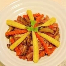 玉米尖烩培根是一道美食,主要制作材料有松仁、金针菇、胡萝卜、干货香菇等。