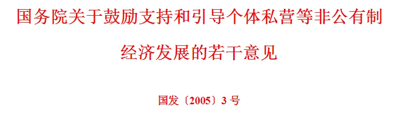 2005年2月,国务院下发了《关于鼓励支持和引导个体私营等非公有制经济发展的若干意见》(国发[2005]3号)。《若干意见》按照党的十六大、十六届三中和四中全会精神及宪法修正案要求,着力消除影响非公有制经济发展的体制性障碍,确立平等的市场主体地位,明确提出了今后一个时期鼓励、支持和引导非公有制经济发展的总体要求,从放宽非公有制经济市场准入、加大对非公有制经济的财税金融支持、完善对非公有制经济的社会服务、维护非公有制企业和职工的合法权益、引导非公有制企业提高自身素质、改进政府对非公有制企业的监管、加强对发展非公有制经济的指导和政策协调等七个方面具体提出了促进非公有制经济发展的重要政策措施。