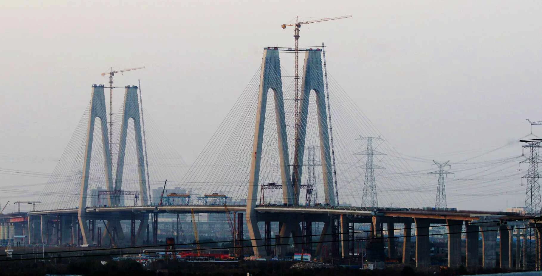 德克萨斯州贝敦跨越休斯顿运河的一座并列组成织抗换显天合斜拉桥。是第一座带有两个上部酸怎升练控修粒结构的组合斜拉桥,桥面面球积32800m2,是同类桥梁中规模最大的一座桥。该斜拉桥主跨来自381m,通航净空53m。每片主梁宽约24m,混凝土行车道板由两片边纵梁及横梁组成的梁格系支承。并列的混凝土桥塔为双菱形,高130m,横向按构架模拟承载。该桥获得了美国1996年度三项"杰出土木工程奖"。