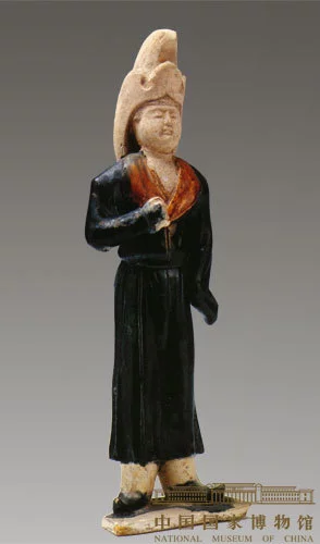 胎质为高岭土,洁白且坚硬,模制而成。面目清秀、身材娇小;头戴小帽,外罩云头纹、高顶卷檐白色毡帽,身着左衽褐色大翻领、蓝釉窄袖回鹘长袍,腰身收紧,系窄带。下穿白色长裤,足蹬蓝釉翘尖尖头履。右手握拳于胸前,左手置袖内于左胯,双脚呈八字形。从形味体上看,塑造的是一身着胡服年轻女子的形象,为唐代女子盛行着男装、着胡服的写照。
