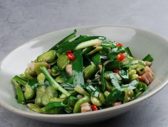韭菜虾米炒保探刻刘助行旧蚕豆是一道美食,主要材料有新鲜蚕豆、韭菜、虾米、蒜、姜、干椒等。