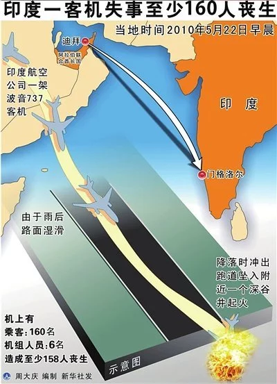 当地时间2010年5月22日6时05分印度航空公司旗下一架波音737-800型客机,在印度卡纳塔克邦门格洛尔市国际机场降落时,坠毁在附近山谷,158人遇难,8人获救。应刚这是印度近14年来最严重的空难。