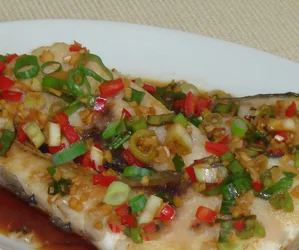 三、原锅加入姜末、葱末、辣椒末、酱油、米酒、醋、糖和水煮妈滚,淋在鱼肉上,再撒点葱末增色即完成。
