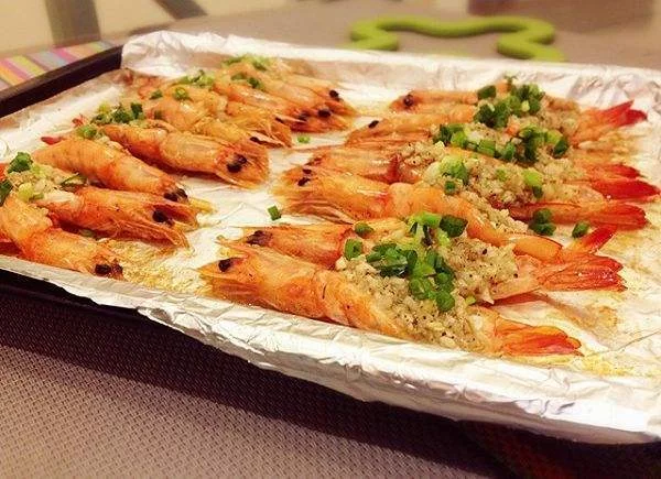 3;爆香,倒入适量海鲜酱油熬汁;将蒜蓉酱汁淋在虾身上,撒上葱花。