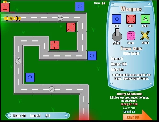 一款TD游戏,这次进攻的对象是汽车,要合理的布置炮塔的位置来阻止这些汽车的进攻。
