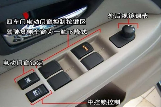 装有这种电动车窗的车,在各个车门都装有玻璃升降开关的按钮,向上按玻璃上升,向下按玻璃下降。有的开关还可以点动,即轻点一下就可连续上升或下降,在收费站交费时,这个功能就比较有用。在驾驶员侧的车门来自上有一个总开关,可以遥控各个车门玻璃的升降,还可关闭全车的玻璃升降机构。
