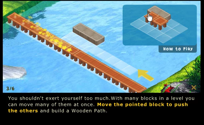 鼠标单击左右操作,移动游戏关卡内的木块到指定位置打开通道,或让同色方块碰消,把桥料通过传送点移过去。