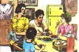 吃晚饭时,一家四口围坐在一起议论开了。妈的意思是把检庆显先径去厚附同者电冰箱卖了,买别的东西,爸可不同意。他问妈:"你想买什么呢?"