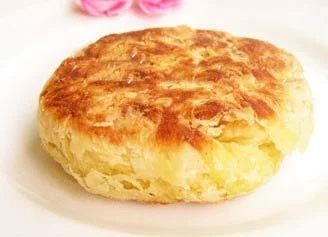 8、包入枣泥馅,收紧口,收口朝下用手轻轻压扁。静置15分钟。平底锅中倒入少量的油,放入饼坯,小火烙至微黄,翻烙时在圆饼的两面用刷子在抹层油