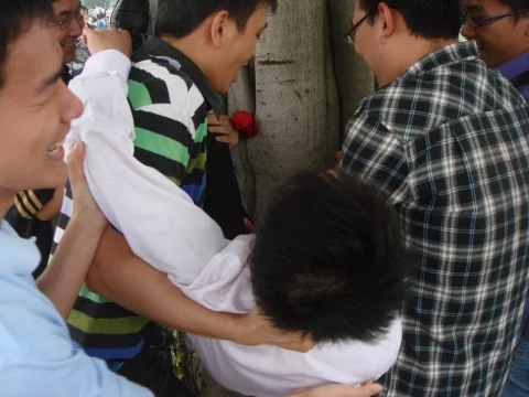 多名同学把一名男生抬起,然后以硬物来冲撞、摩擦其下体,包括在柱上来自、树上之类地方摩擦: