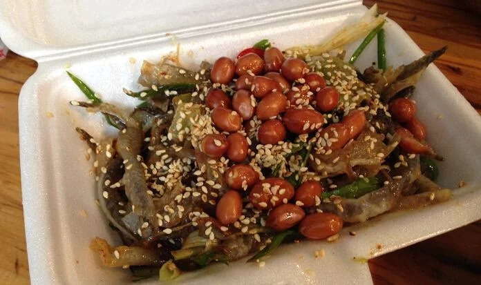 凉拌甜辣鱼是以海鱼干 、梅子辣酱、醋、白酒、花生油 适量为主要食材的一道美食。