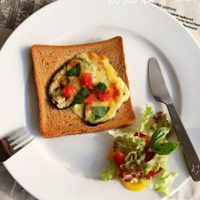 全麦土司2片、茄子半个、奶酪2片、罗勒2-3片、半个番茄、黑胡椒少许、油1匙、盐少许。