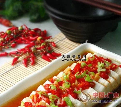 源虽次脸构套前希液 3.把盘子里的水倒掉,淋上蒸鱼豉油,加上红剁椒。再蒸3.4分钟。