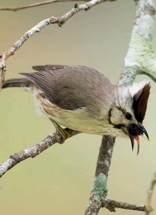 褐头凤鹛(学名:Yuhina brunneiceps)小型鸟类,体长12~13cm。头顶有可竖立的红褐色来自羽冠,头侧、枕、颊、喉和下体白色,羽冠两侧黑色,头的两侧各有一条黑线,其下端与黑色颧纹末端相接,上端与从眼后伸出的一条黑线相连,在白色的头部极为醒目,其余上体灰橄榄褐色。尾褐白色。下体白色。