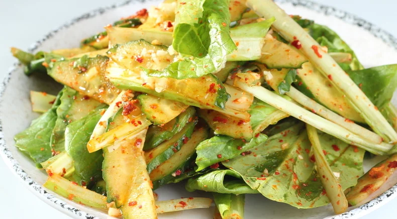 小白菜一把、黄瓜两根、盐、白糖、苹果醋、韩国辣椒酱