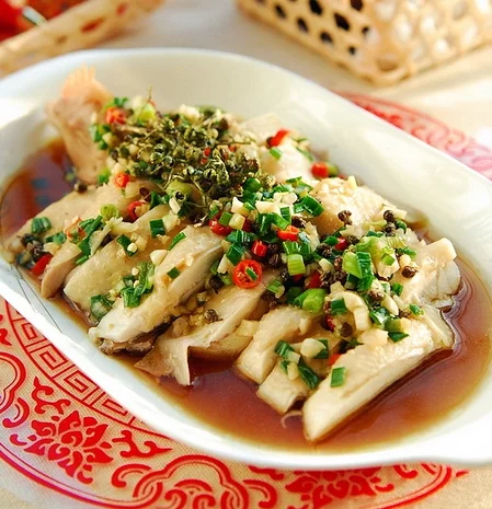 6、将花椒油泼在步骤4的料碗中,加煮鸡的原汤、盐、糖和少许360百科蒸鱼豉油拌匀,浇在斩件的鸡上,最好浸泡1小时之后再吃。