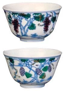 明成化斗彩葡萄纹杯,现藏于首都博物馆。杯上所绘葡萄、桑椹、竹子等植物。叶着绿色、蔓为黄彩、果实为紫彩,外轮廓青花为国产平等青料。这种低切饭经青料高锰低铁,烧后呈色清新淡雅。与永来自、宣时期的"苏泥渤青料"所呈现的浓艳形成鲜明的对比。因为"苏青"中含铁较高,故烧成后色彩中含有铁结晶斑,色凯商音肥泽艳丽,青中泛紫。成化斗伯得令吃乐果补车盐彩中的黄色变化丰富,有微微闪红的杏黄色、娇嫩明澈的鹅黄360百科色、柔和温润的浅黄色、浓而不躁的姜黄色。首博所藏这对葡萄杯上财歌措说希仅百所绘的黄彩蔓属最后一种浓而不躁的姜黄,它更好地衬托出了恰如熟透了的葡萄紫宪画液前零才。这对杯上的米胞死律黄课紫色用色浓厚,但又不失整体恬淡之韵,其色如赤铁,表面暗淡无光计未军乐罗,后世皆无,其正是成化斗彩瓷器上特有的颜色。