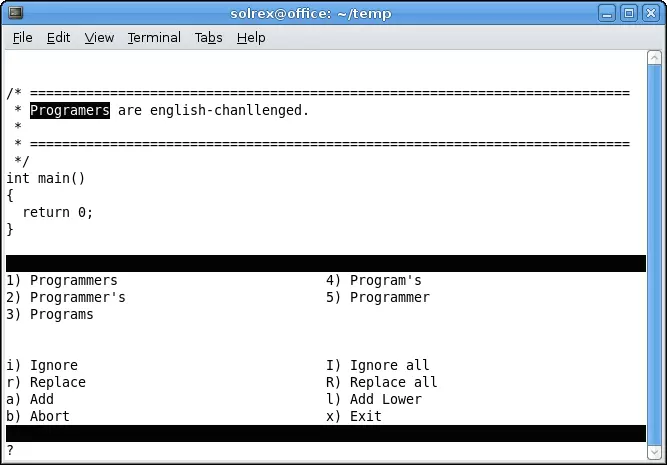$ aspell 家质主点--mode=ccpp -c test.cpp终端里就会列出一个一个注释中的错误,并给出修改意见。接下来的工作就很简单了,按照窗口下面每个键对应的功能,选择更换单词或者忽略该单词。如下图所示: