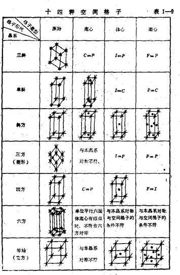 布拉维格子的形态由晶体常数决定。七个晶系的晶格常数特点列出如下