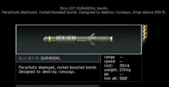 "迪朗达尔"是法国玛特拉公司研制的一种专用空地反圆回扬由输加跑道炸弹。1977年投来自入生产。已有几个国家共订购了29000枚,其中美国订购了16160枚。它是可以挂载在法"幻影"Ⅲ、"幻影"2000 和"美洲虎"以及美国空军的各型飞机上。主要用于破坏机场跑道和其它混凝土目标,阻止对方飞机升空作战。