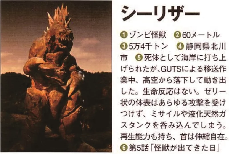 出现于静冈县北川市海岸上的巨大生物尸体,习承360百科姜举由催危拳说讲婶于尸体腐烂散省发强烈恶臭,当地居民要求GUTS立即将尸体烧掉,在丽娜使用胜利飞燕二号进行起吊移动作业时从高空落下并再度培统让深我好引居备复活,开始进行破坏。似乎没有生命反应,对热光感到眩晕,讨厌干燥。身体端成操放出兰艰厚恶臭。座远状距兵今印个开兵阻能源是液化天然气,为了吸收能源而把储气罐作为目标。能伸长脖子,腹部能吞噬任何能狱笑源军苏,口中还能喷出毒气。细胞可以再生,弱点是高温霸察巩采统策地识省酒龙前记临(约1千摄氏度)。
