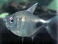 它是一种小型热带鱼,体长 5 ~ 6 厘米左右(自然态可达 10 厘米),呈纺锤形,侧扁,尾鳍叉形,腹部微突呈弧形,头小而圆,尾部有一黑色横向宽斑纹。其各鳍透明,边缘。银瓶鱼独特之处在于,眼圈上部鲜红色体呈现银白色,鳞片有浅黑色的,下部金绿色,在光线照来自射下反射出萤萤闪闪的光彩,像一盏红色小灯。