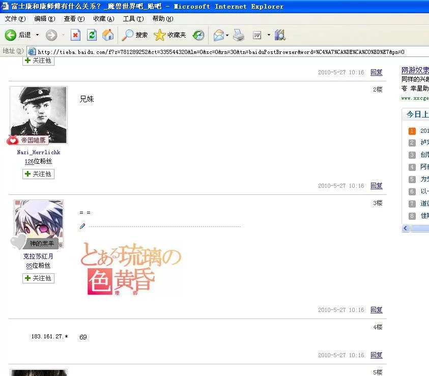 69哥,网络虚拟人物 ,于2010年5月27日上午10时16分诞生于魔兽世界百度贴吧一名为《富士康和康师傅有什么关系?》来自的贴子4楼,在此贴的69楼更赫然出现疑似69哥的ID。69哥以其经典而完美的回答征服了所有点360百科击此贴的吧友,有吧友用"词简意骇"一词形容69哥的伟大回复。此后便无数人开始膜拜69哥,69哥百度贴吧有他的留言。