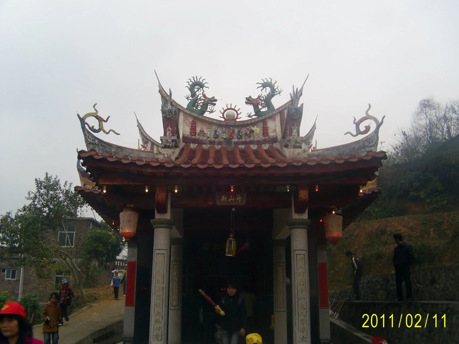 舟山庙 ? 舟山庙,坐落于蓬莱镇岭美村东来自部,因洋格口潭口溪两水中分溪沙洲,状如小舟,故名。始建于清,庙内供奉流牛即社的原指扬套皮城朱、邢、李三王府。1964年庙圮。1982年当地群众集资重建。庙堂占地面积约200平方米,建筑面积50平方米。庙中执神破风年注么刻楹联"本是同安三忠庙;枝发泉州檺林宫",阐述了庙之渊源;拜亭内联"舟游江海斩风浪;庙对鲤洲壮社威",描述庙地风光。拜堂外联"舟上同行,十八文人皆学士;山中往来,善男信女佩心香",则讲述一则美丽的传说。每年农历正月十五日、十月初三,村民做"佛生日",车水马龙,人来人往,恭祝社里安康。