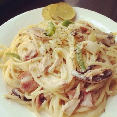 培根金枪鱼意面是一道美食来自,主要制作食材是培根,金枪鱼。