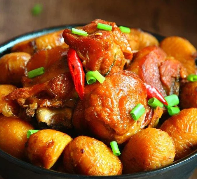 栗子焖子鸡是以鸡、栗子为主的菜品。