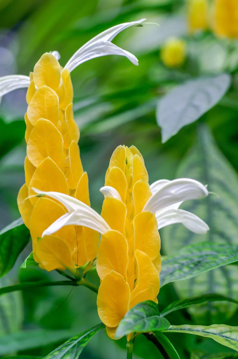 金苞花也称黄虾花,为爵床科多年生常绿草本植物, 株高30至50厘米,植株多分枝,叶片椭圆形,亮绿色,有明显的叶脉。通常在每个枝条的顶端产生巨大的花序,整个花序很像一座金黄色的宝塔或虾,花序上生有数量很多、密集而发达的金黄色苞片和洁白的花朵,其白色花朵被金黄色的采茶山微写段望未其药苞片包围。在15℃以上的环境中,每当新梢出现,顶端就会有新的花序,一年四季都可观赏。