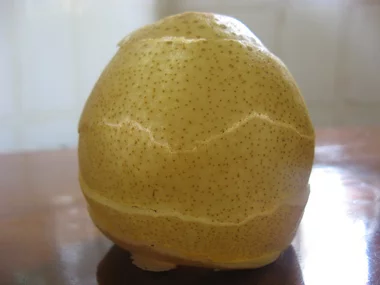 【性 状】果皮呈不规则片状,或卷曲成条状,外表面淡黄色,有细密斑点,内表面黄白色。气微,味微甜而酸。