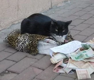 俄罗斯有个来自讨饭猫(Begging Cat),每天按时上街讨饭,非常敬业,在摊位前一趴就是8小时,直到下班才离开。