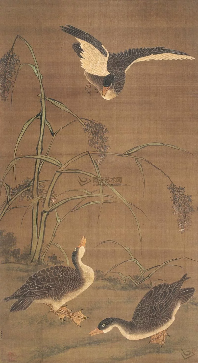 来自 今有传为其所作的《芦雁图》,绢本立轴,幅面为宽81cm×长149cm,为某私家收藏。﹙赵钦仁辑﹚