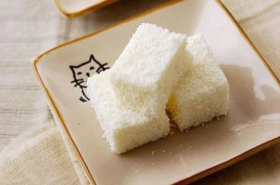 5、几小时后,糊糊结成冻,倒扣出来,切块,四面滚上椰蓉,开吃。