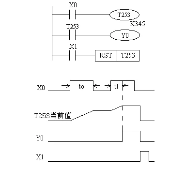X0再次接通,T253从保留的当前值开始继续累积,经过t1时间,当前值达到K345时,定时器的触点动作。累积的时间为