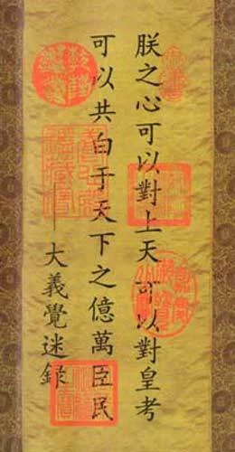 疆域辽阔的大清国中,大多数人并不识字。雍正皇帝选取了才学与道德都值得他信赖的文人,派遣到西北宣讲《大义觉迷录》的宗旨。这些长期埋首于儒学经典与权力斗争中的京城官员,穿越还算繁华的市镇,走到人烟稀少的乡村。在所到之处,他们建立起一座座临时"龙亭",焚烧香料,在努力营造的庄严气氛中,大声宣讲《大义觉迷录》。据记载,当时在兰州的一场讲授中,宣讲者是郑禅宝,大约有一万名士兵和百姓聚集在一起,虔诚地听讲,在理应人烟稀少的酒泉,则有两万人加入了听众的队伍。全国的其他各地,也是书声琅琅,对《大义觉迷录》的宣讲不绝于耳。