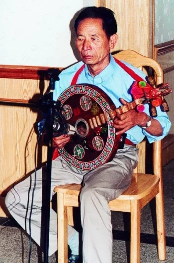 盛情之下,阿家文抱出一把伴随自己20年的琴弹起来。那是一把光滑油亮的老琴,音孔是一个圆形,琴面上雕刻着龙凤图案,琴把上有从高到低的音阶品位,琴把端是一个张口的龙头。阿家文抱起四弦琴,左手按动音阶,右手弹奏,双手指头变幻无穷,随意翻飞,一上一下像跳迪斯科。